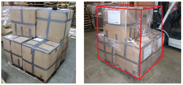 2. PALLETIZING INCREASES CHARGEABLE VOLUME. Regardless of the sizes of items on a pallet, the overall chargeable (gross) volume will always be calculated based on the longest, widest, and highest dimensions of the skid. See the pictures to see how it works: